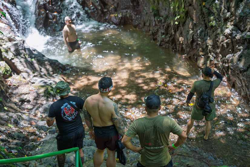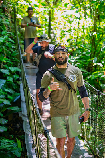 The next morning, we headed to Rainmaker Conservation Park near Parrita, a little over an hour away from Los Sueños. Mick, the owner, graciously donated the entrance fees, saying, “the veterans are always welcome at Rainmaker – they are the living embodiment of freedom and eternal vigilance.” Rainmaker is a self-guided loop along a well-maintained path through the rainforest jungle that includes suspension bridges along the canopy and several waterfalls and swimming holes. We heard toucans calling out, saw multiple lizards, and even found a poison dart frog! Unlike some of the other groups that see the trail as something to accomplish, this group was challenged to take their time, be present, and enjoy the experience…and they did not disappoint: laughing, joking, taking group photos…we made great memories before heading back to Los Sueños for our final time in group discussions.